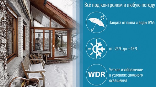 Корпус камеры соответствует классу защиты от пыли и влаги IP65 при диапазоне рабочих температур от -25 до +45°С. Углы поворота объектива – до 180° по горизонтали и до 90° по вертикали.