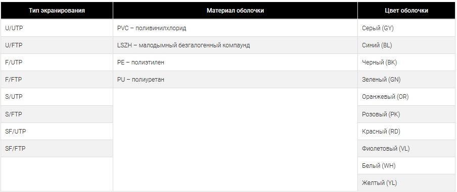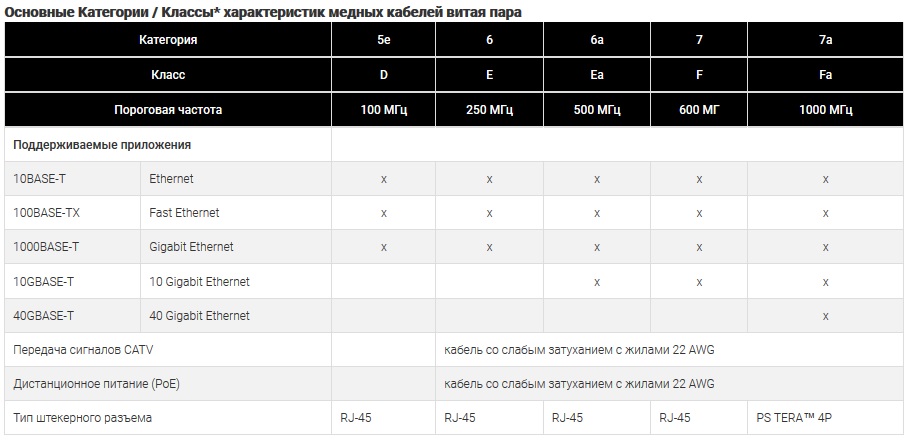 - Категории 6, 5е и 5 экранированные и неэкранированные